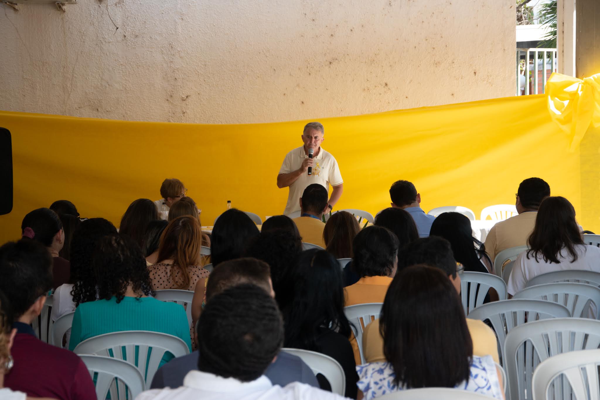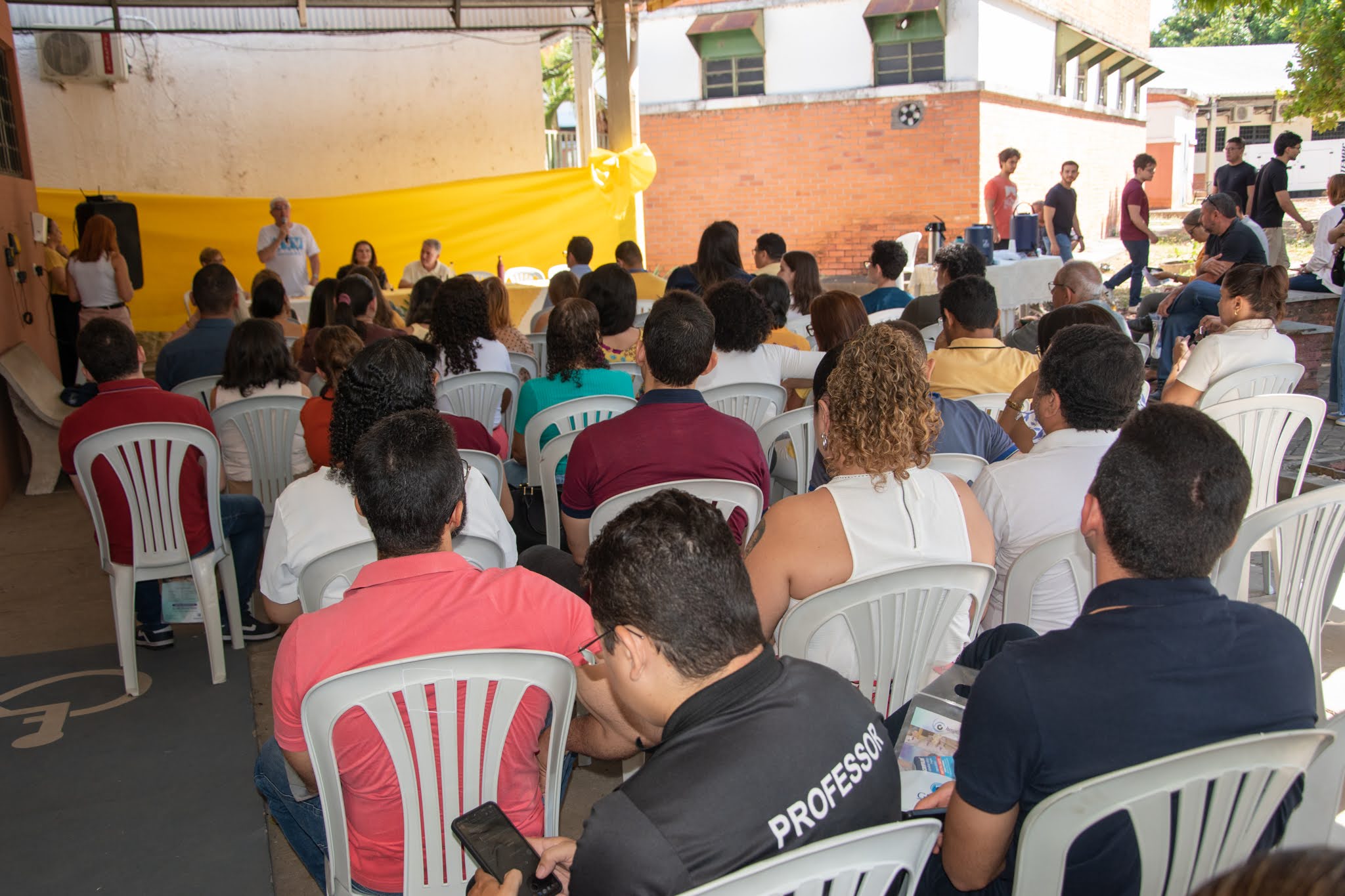 O professor Mateus Ibiapina foi responsável por movimentar o público com música e alongamentos, promovendo descontração, risadas e um momento de integração entre os participantes.