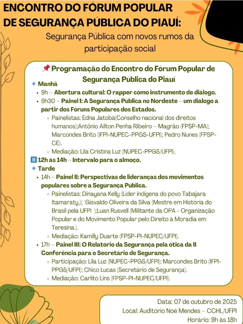 A Universidade Federal do Piauí (UFPI) sediará, no dia 7 de outubro, o Encontro do Fórum Popular de Segurança Pública do Piauí, que terá como tema “Segurança Pública com novos rumos da participação social”. O evento será realizado no Auditório Noé Mendes, localizado no Centro de Ciências Humanas e Letras (CCHL), das 9h às 18h, reunindo representantes de comunidades, pesquisadores, estudantes e gestores públicos. Inscreva-se aqui.