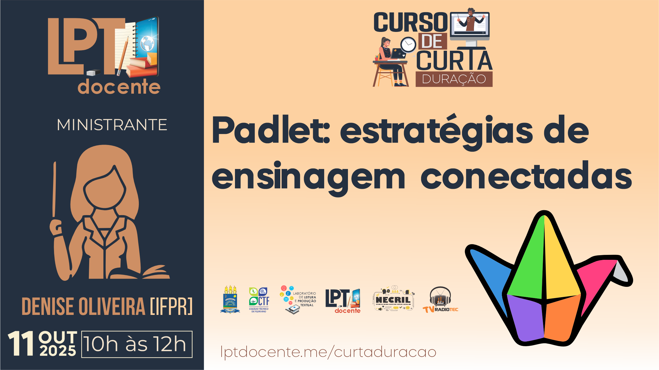 Já o curso Padlet: estratégias de ensinagem conectadas objetiva capacitar os docentes para o uso do Mural Interativo Padlet na promoção de estratégias interativas e colaborativas no ensino e aprendizagem da língua em uma perspectiva interdisciplinar, potencializando a criatividade, o engajamento e o desenvolvimento de habilidades linguísticas dos alunos e será ministrado pela professora Denise Claudete Bezerra de Oliveira [IFPR], em turma única e com vagas ilimitadas. As atividades serão realizadas no canal da TV Radiotec no YouTube, conforme dia e horário descritos no cartaz a seguir: