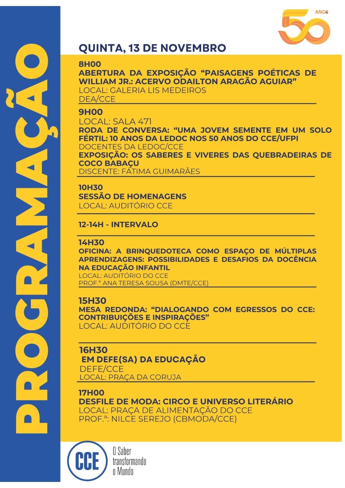 O Centro de Ciências da Educação “Professor Mariano da Silva Neto” da Universidade Federal do Piauí (CCE/UFPI) promove, nos dias 12 e 13 de novembro, uma programação especial em comemoração aos seus 50 anos de criação. As atividades iniciam às 8h, nas dependências do CCE.