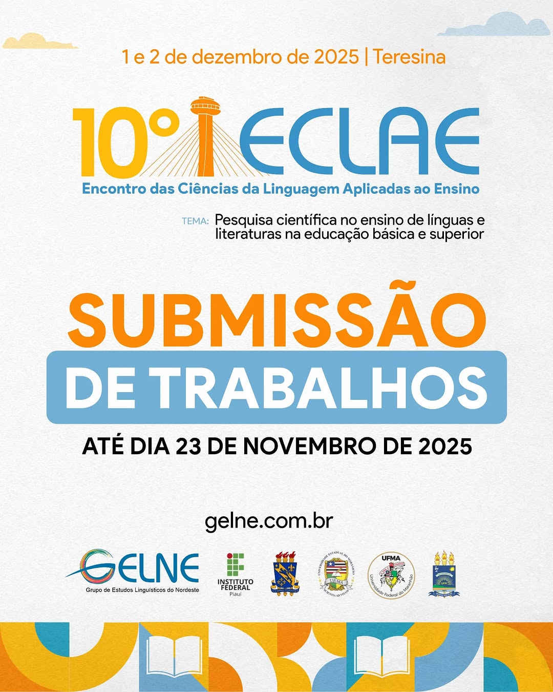 A Universidade Federal do Piauí (UFPI), por meio da participação de docentes no Grupo de Estudos Linguísticos e Literários do Nordeste (GELNE), participa da 10ª edição do Encontro das Ciências da Linguagem Aplicadas ao Ensino (ECLAE). O evento acontecerá nos dias 1 e 2 de dezembro, em formato híbrido, com programação presencial no Instituto Federal do Piauí (IFPI) – Campus Teresina Central.