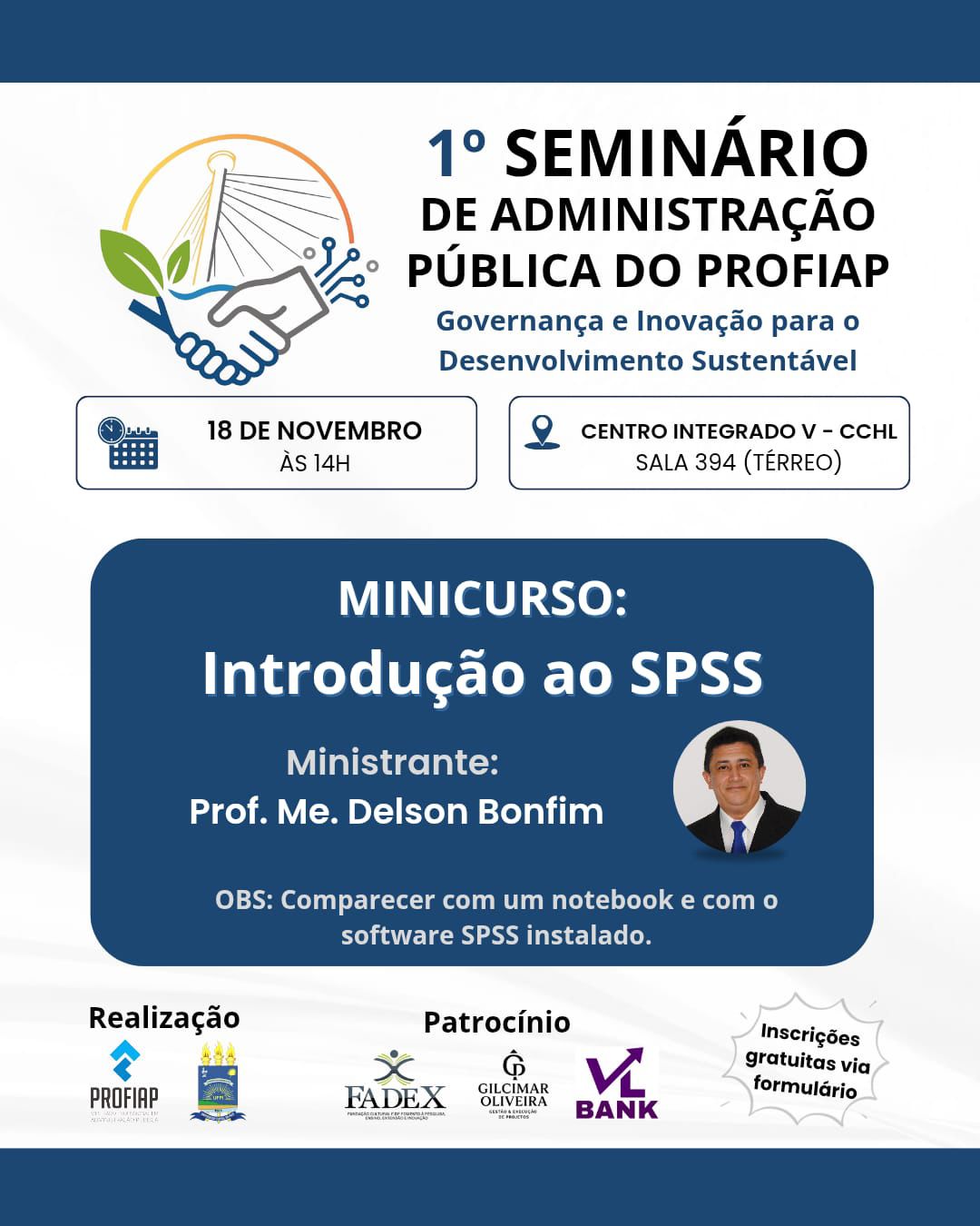 14h – Minicurso: Introdução ao SPSS, ministrado pelo Prof. Delson Bonfim