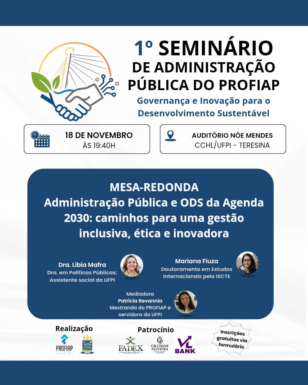 19h40 – Mesa-Redonda: “Administração Pública e ODS da Agenda 2030: caminhos para uma gestão inclusiva, ética e inovadora”, com participação de Líbia Mafra (Dra. em Políticas Públicas e Assistente Social da UFPI) e Mariana Fiuza (Doutoramento em Estudos Internacionais pelo ISCTE), mediada por Patrícia Revannia, Servidora da UFPI, Especialista em Gestão Pública e mestranda do PROFIAP.