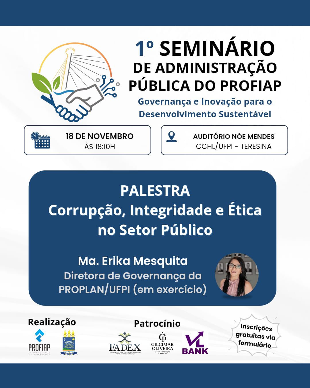 18h10 – Palestra: “Corrupção, Integridade e Ética no Setor Público”, com Érika Mesquita, Diretora de Governança da PROPLAN/UFPI (em exercício)