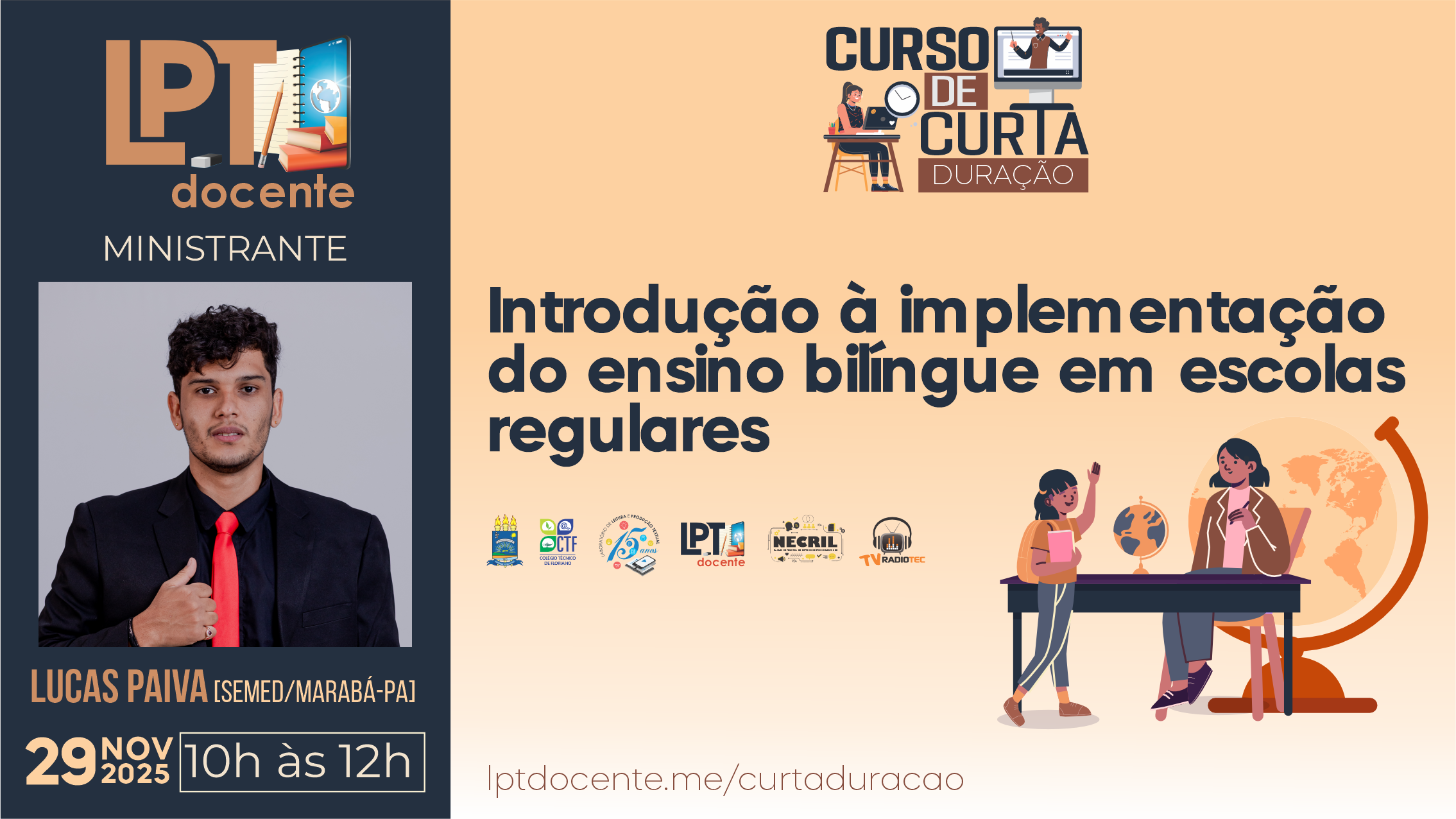 Já o curso Introdução à implementação do ensino bilíngue em escolas regulares objetiva demonstrar como teorias pertinentes orientam a adesão aos programas bilíngues nas escolas regulares e será ministrado pelo professor Lucas Ramon Paiva Melo (SEMED/Marabá-PA), em turma única e com vagas ilimitadas. As atividades serão realizadas no canal da TV Radiotec no YouTube, conforme dia e horário descritos no cartaz a seguir: