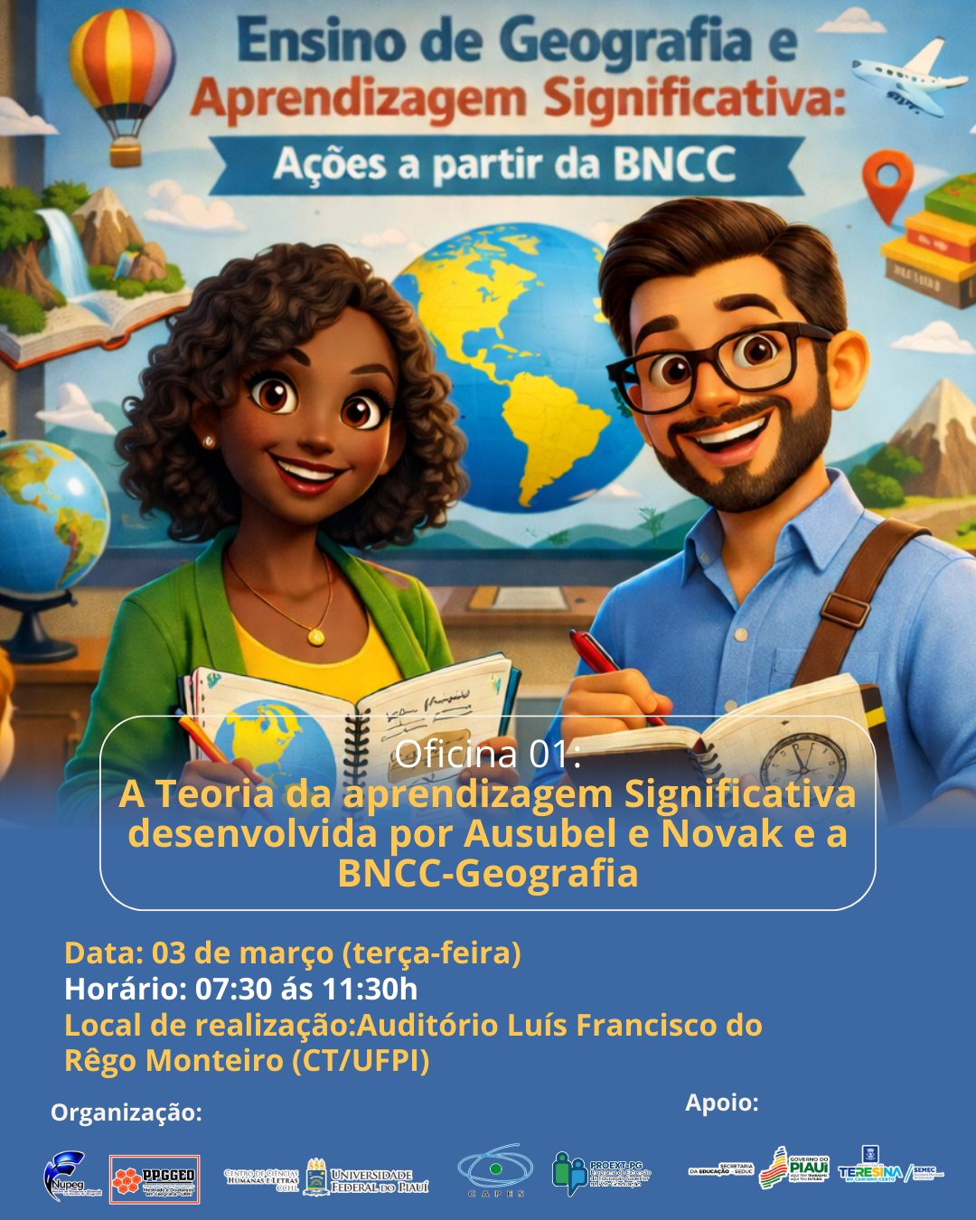 O Programa de Pós-Graduação em Geografia da UFPI (PPGGEO), em parceria com o Núcleo de Pesquisa em Ensino de Geografia da UFPI (NUPEG), realiza no dia 3 de março de 2026 a sessão de abertura do Projeto de Extensão em Ensino de Geografia e Aprendizagem Significativa: Ações a partir da BNCC, vinculado ao PROEXT-PG da Coordenação de Aperfeiçoamento de Pessoal de Nível Superior (Capes).