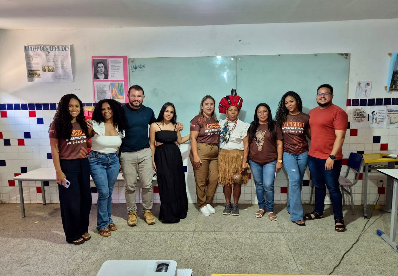 Turma de Pedagogia Intercultural Indígena de Uruçuí com coordenador do curso, professor formador e liderança indígena